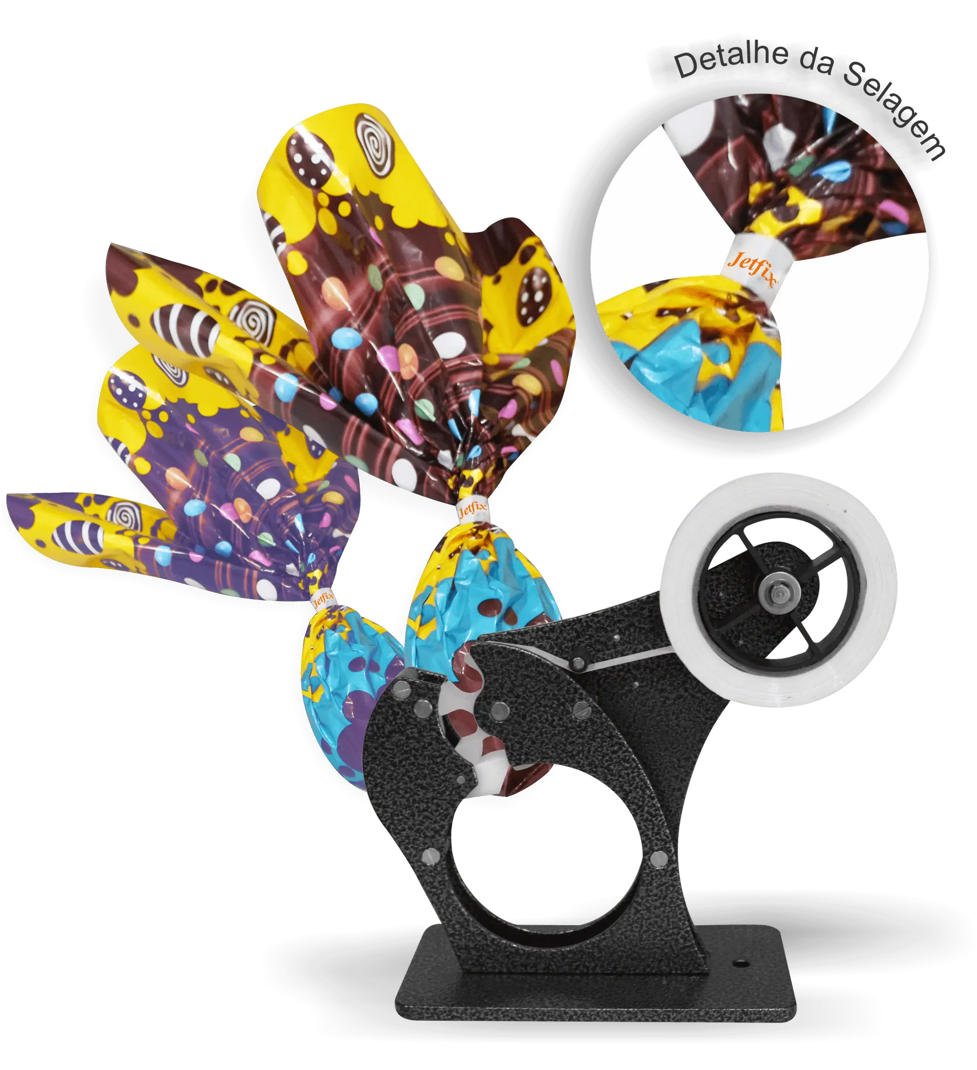 The JETFIX PA100 sealers have a distinctive feature: an opening for the removal of packaging and products after sealing. They are designed to seal cables and close packaging for various items, such as easter eggs, panettones, cookies, giveaways, and kits, providing versatility and efficiency in different applications.