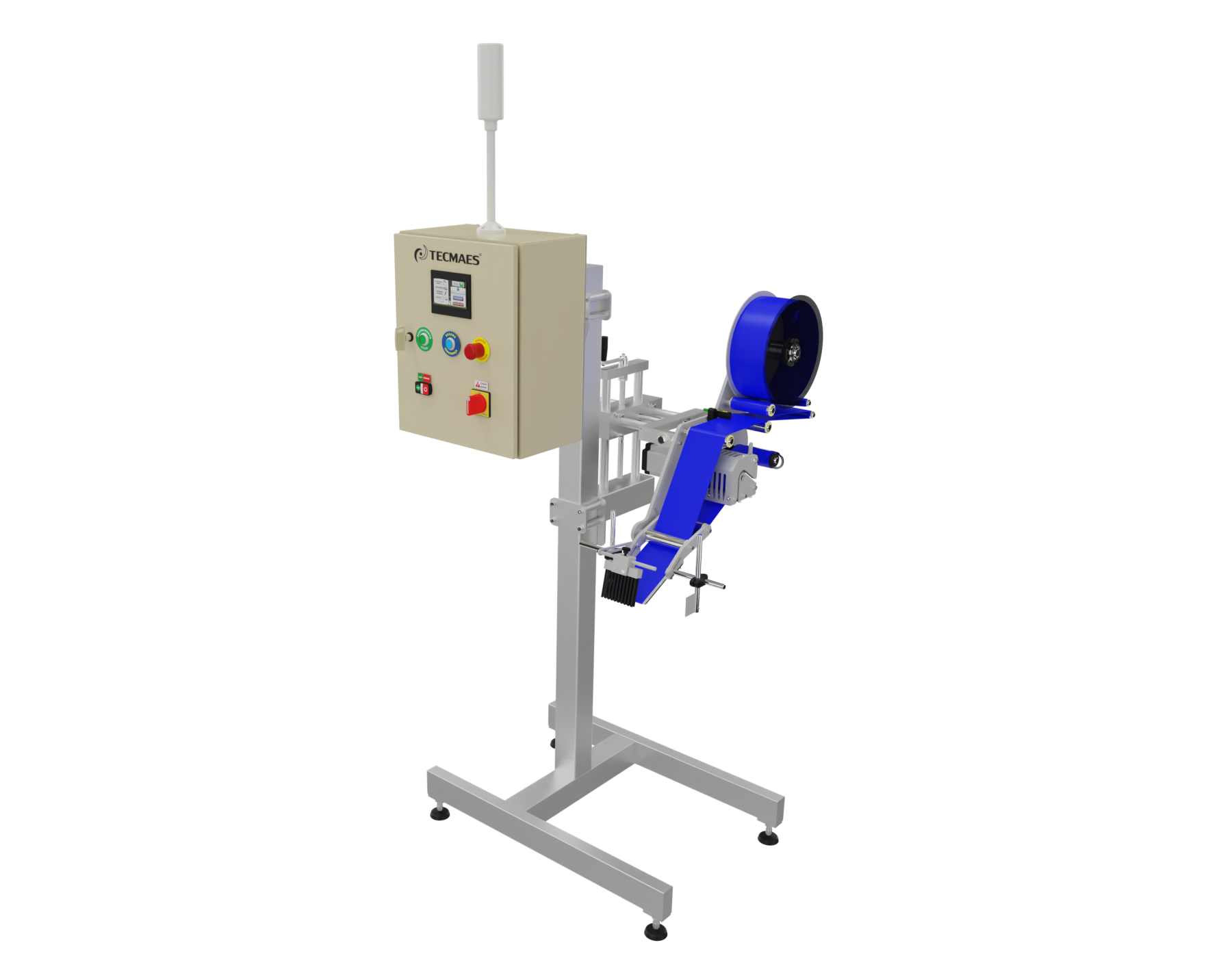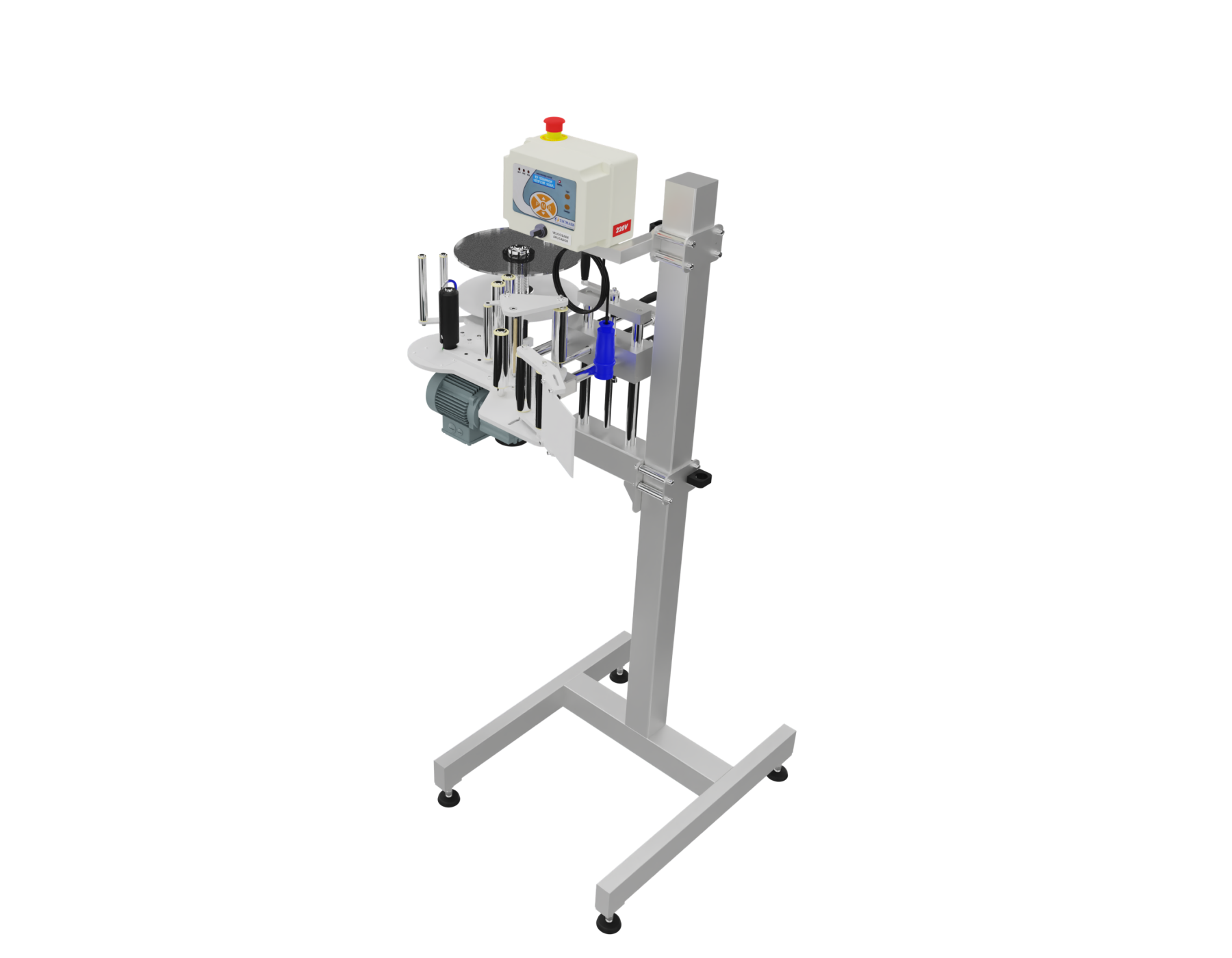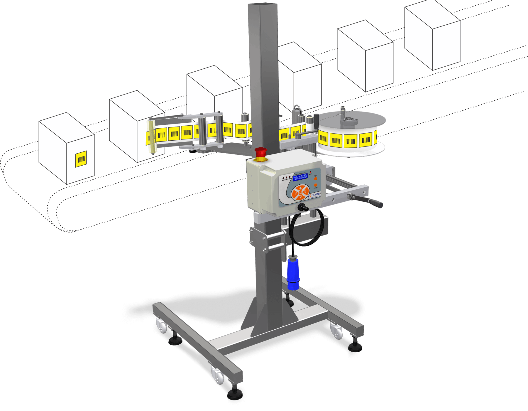 The Pedestal Label Applicator System has height and position adjustments, allowing labels to be applied to both the top and side surfaces of the product.